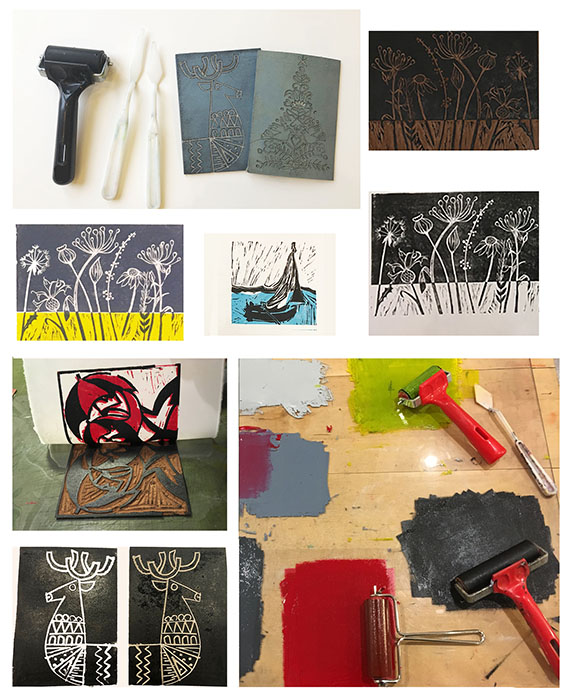 | Linocut printing involves cutting away from a block of linoleum, and inking and printing the uncut areas. There is something beautifully simple about the linocut printmaking process although the prints it produces can be extremely intricate and complex. | ||||||